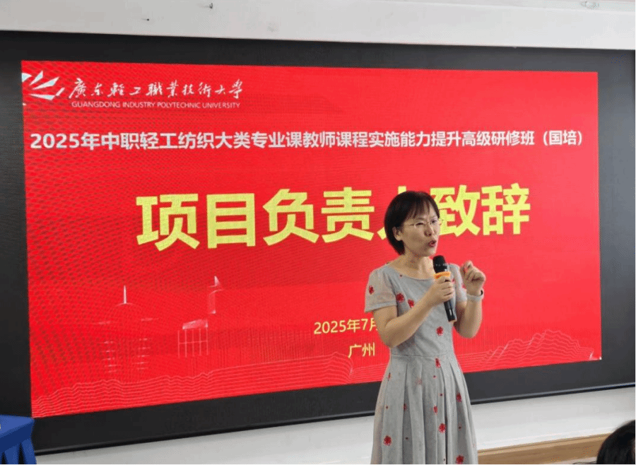 开班仪式上,郭涛副院长首先致辞。他强调,作为国家示范性高等职业院校和“双高计划”建设单位,广东轻工职业技术大学拥有卓越的师资队伍与丰富的培训积淀,该项目团队为本次研修班量身定制了系统化的课程体系。研修班以“产业专业融合、课程教材建设、教育教学改革”为主线,深度聚焦教师课程实施能力的精进。培训内容丰富多元,涵盖职业教育政策深度解读、教学模式创新实践、课程设计与评价优化、企业实践等多维度知识模块。培训形式亦灵活多样,结合了集中面授、互动研讨、企业实地调研等环节。郭涛副院长热切期望学员们能在此期间积极互动,互学互鉴,共同成长,力求将所学知识与技能内化于心、外化于行,转化为推动职业教育发展的强大动力,为个人的职业进阶与长远发展奠定坚实基础。
