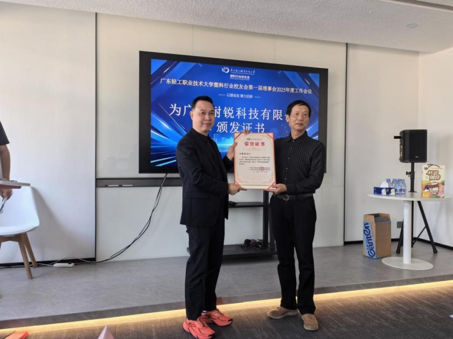 会议同期举行了新晋理事授牌仪式,并对承办单位广东耐锐科技有限公司及第四届“塑友杯”匹克球比赛突出贡献单位予以表彰。耐锐科技董事长王鹏睿结合广轻精神分享了创业心得,彰显校友与母校的精神共鸣。