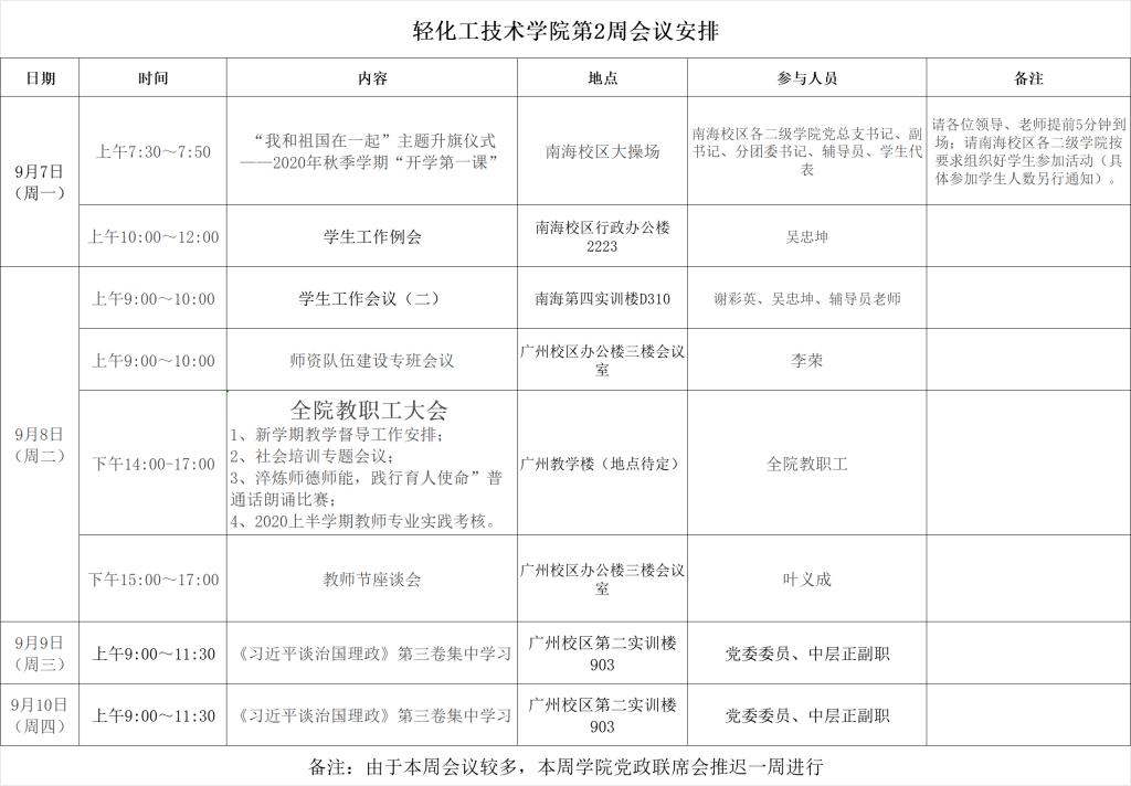 轻化工技术学院第2周会议安排