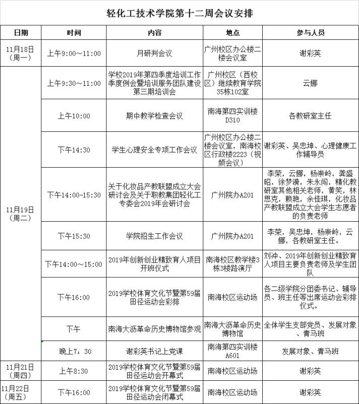 轻化工技术学院第十二周会议安排