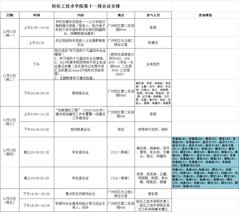 轻化工技术学院第十一周会议安排