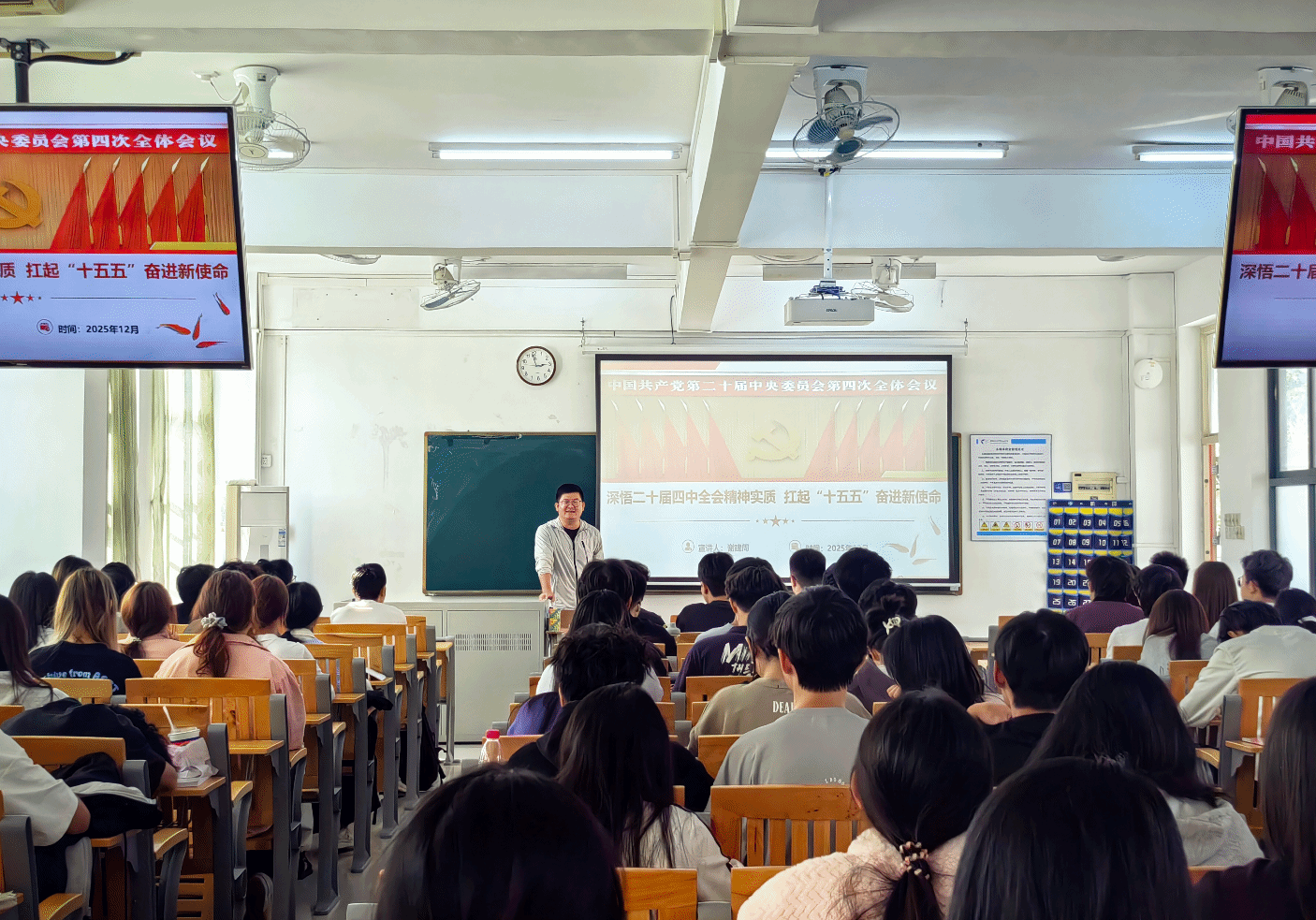 12月5日,谢建周书记在2号楼512-513“落实党的二十届四中全会精神,扛起‘十五五’奋进新使命”为主题向学生干部讲思政第一课。