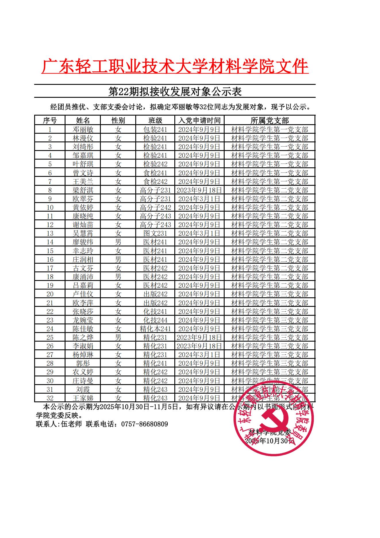 材料学院第22期拟接收发展对象公示